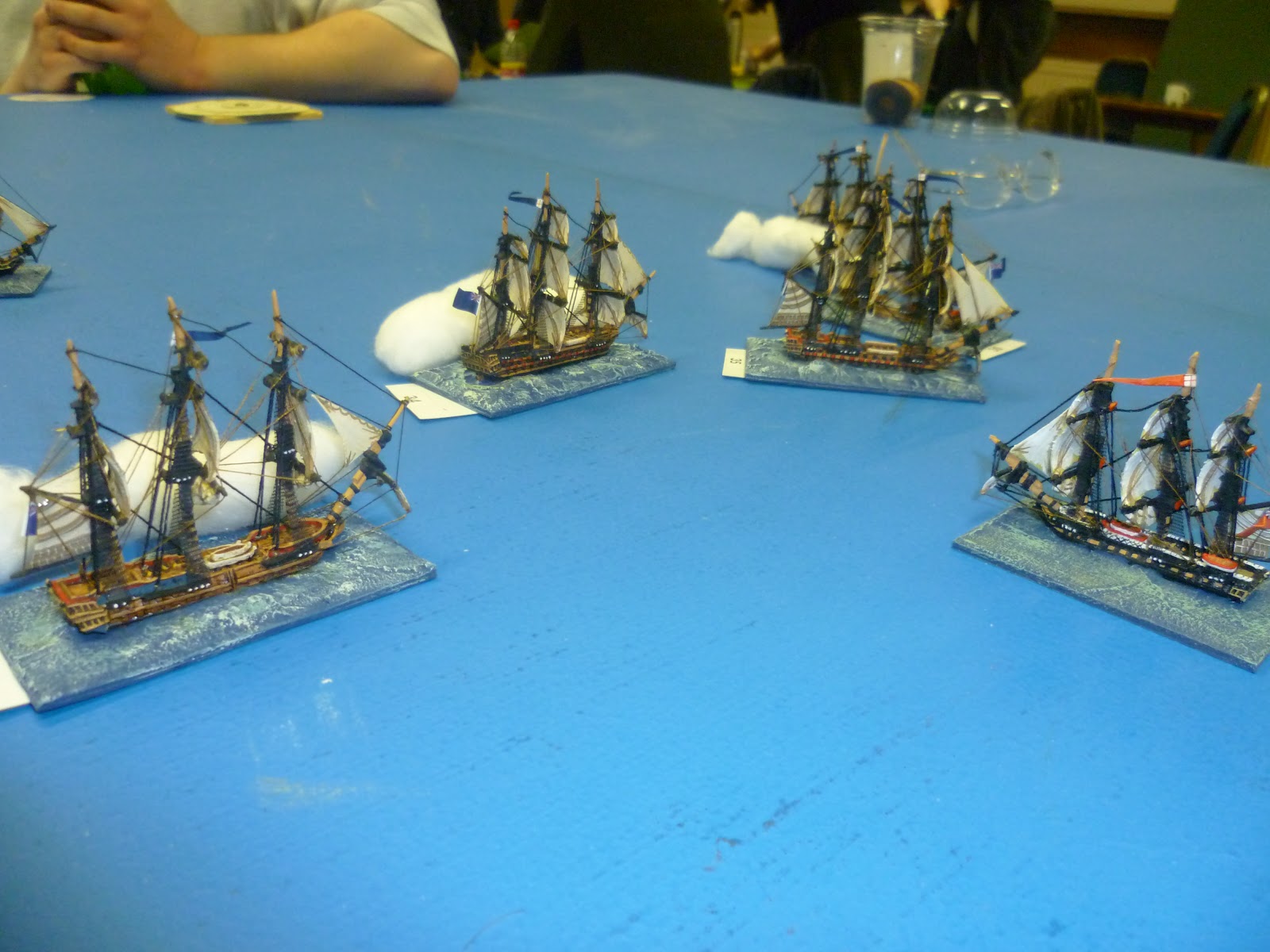 The rules used were a combination of the card play taken from "Kiss Me Hardy" (KMH) by the Too Fat Lardies, and the freely available App "Eight Bells" to handle the combat and sailing stats for our model ships. All the players had to do was draw a card and decide on their actions.