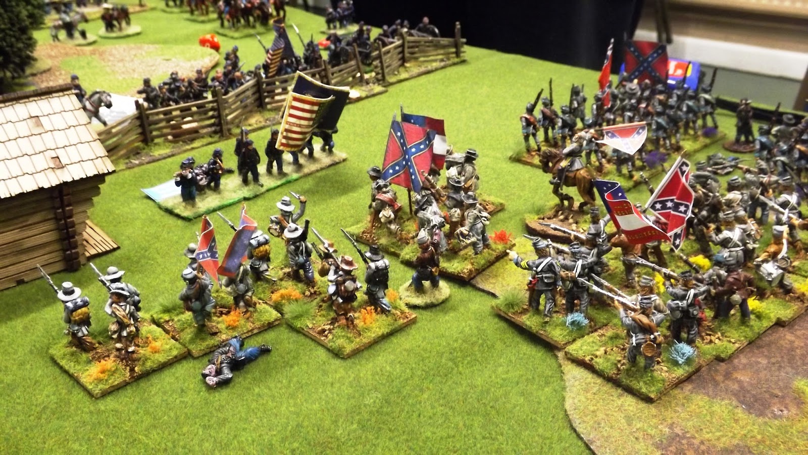 With the two brigades of Hoke and Gordon up on the Union fence line, the struggle reached a higher intensity as Gordon's reserve regiment cleared the Union gun line and carried the position. Their left flank turned and the infantry occupying the wooden shack to their right succumbing to the attentions of the massed fire of the Confederate guns, the Union regiment in the centre fought like tigers managing to draw their struggle with the two shot up regiments from Gordon's brigade in the first combat and narrowly winning by one point the second fight to hold their position.