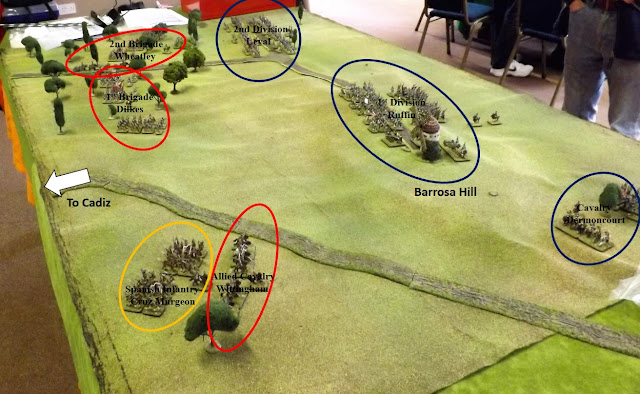 The photo map at the top of the post shows where the respective formations were set up as the two forces were close to engaging, with Victor's 1st Division atop Barrosa Hill and his 2nd Division preparing to sweep down to the coast road just as Graham's Anglo Portuguese emerged from the tree-line ready to attack them.