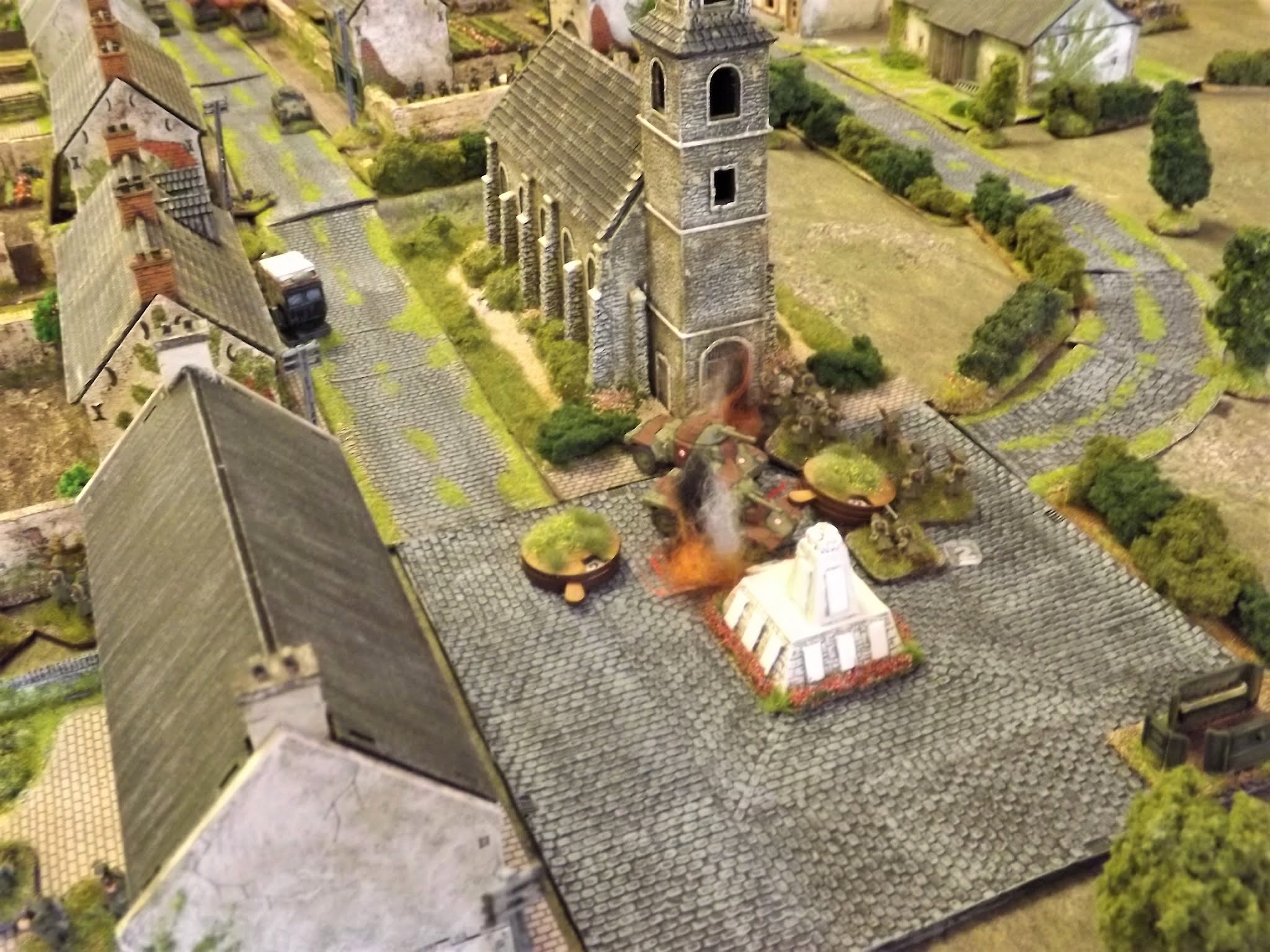 The fighting in this table-top engagement focussed around the main street as French recon elements clashed with the German armoured spearhead before French armour and each sides infantry joined the fray amid the maze of houses, back yards and streets.