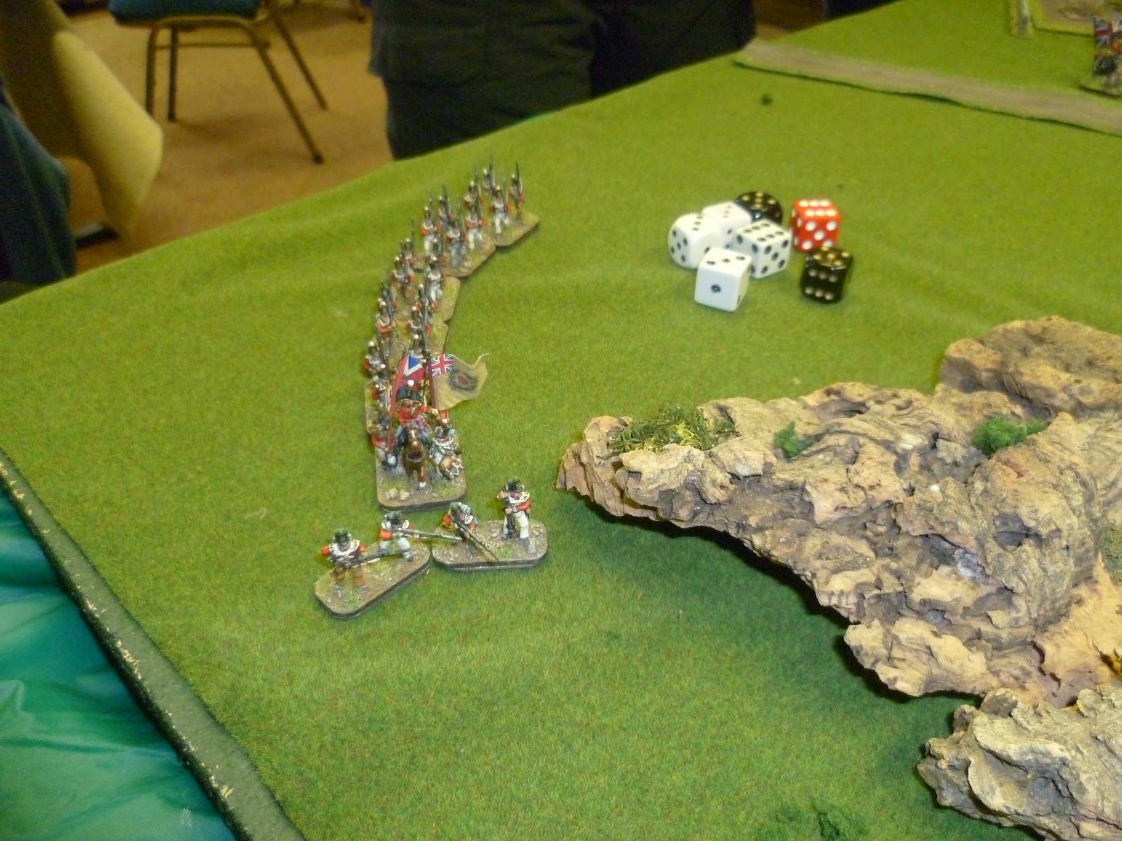 Now with only three infantry units left, but with two turns to resist, the French awaited the British attack. The first attempt came when the 1/9th from Hill's brigade attempting to infiltrate up though one of the flank gullies. The special rule for Colonel Lake's rash assault in the actual battle, came into play requiring the first British infantry unit to reach the ridge to roll a d6 with a 50:50 chance of them being ambushed on the march up. They were and losing a stand fell back to the foot of the ridge.